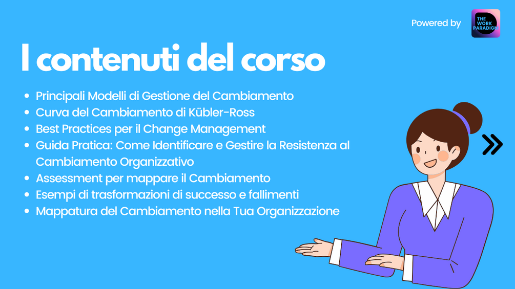 - Il corso sulla Gestione del Cambiamento riduce il senso di incertezza e impreparazione rispetto ai cambiamenti organizzativi moderni.