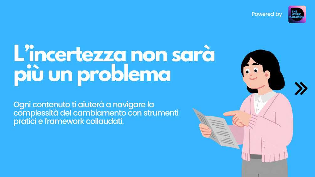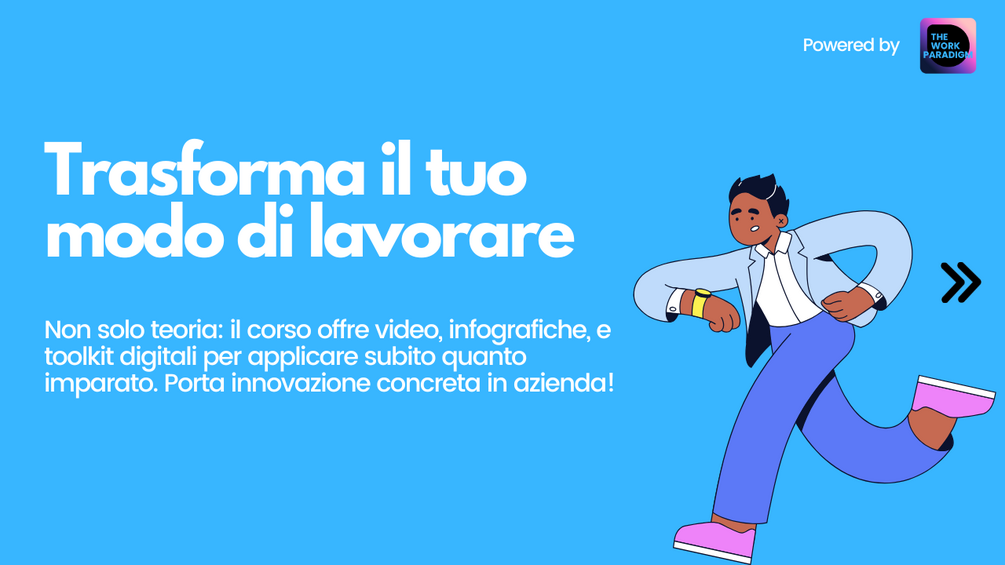 Il corso combina contenuti multimediali (video, guide pratiche, toolkit digitali, infografiche interattive): la soluzione ideale per chi vuole acquisire competenze concrete, aumentare il proprio impatto nella trasformazione aziendale e sviluppare una mentalità sempre pronta al cambiamento.
